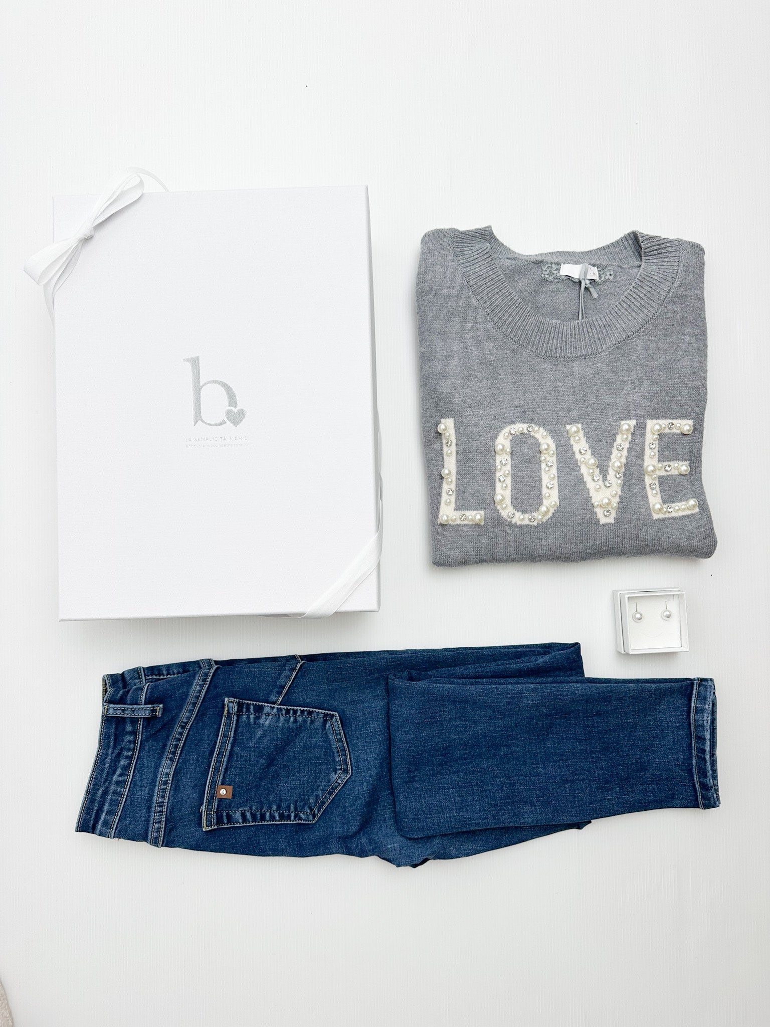 Il primo capo è un meraviglioso maglioncino grigio in misto viscosa caldo e coccoloso con una meravigliosa applicazione e perle e strass che formalo la parola LOVE! Un capo davvero molto morbido e confortevole sulla pelle!