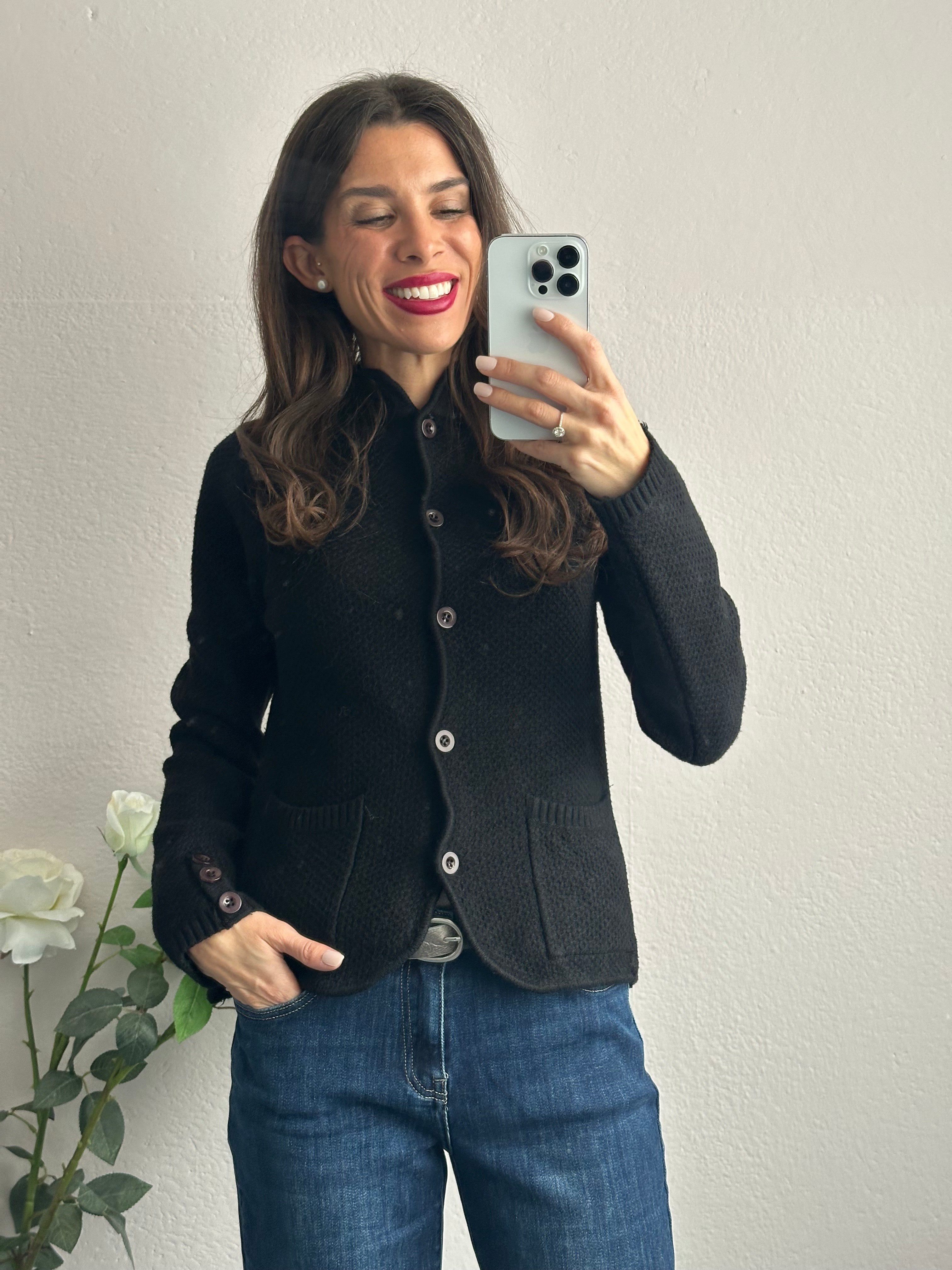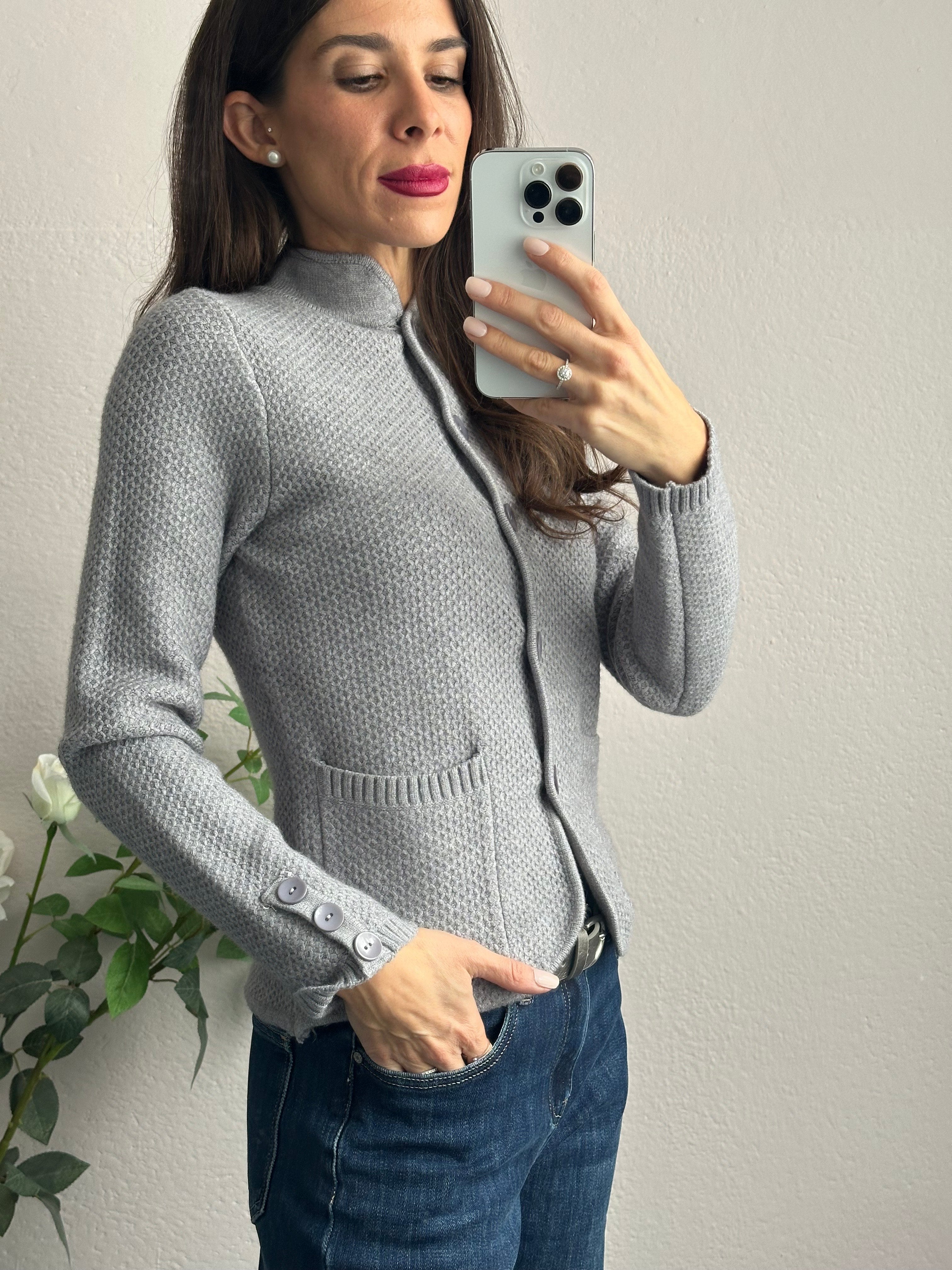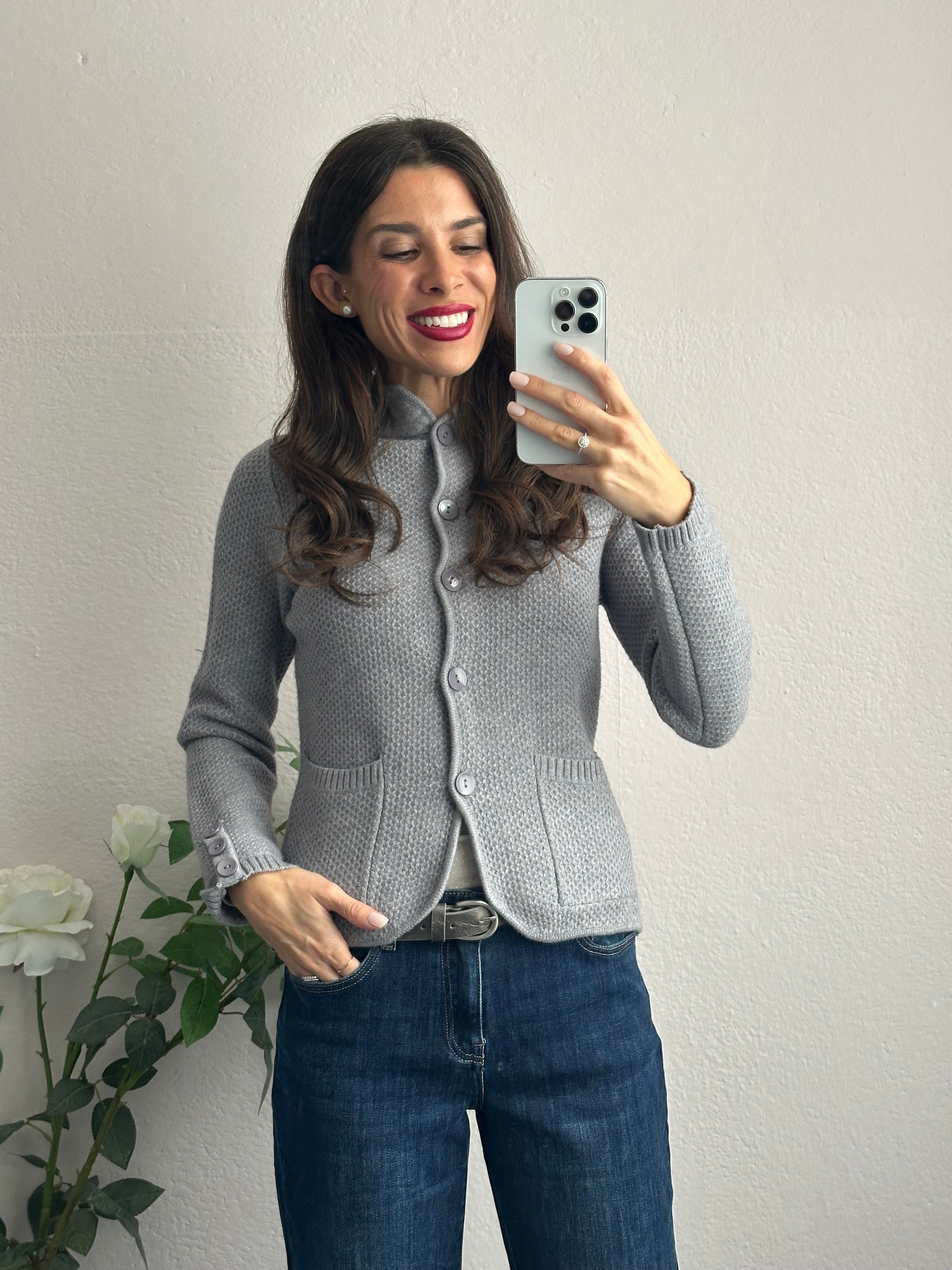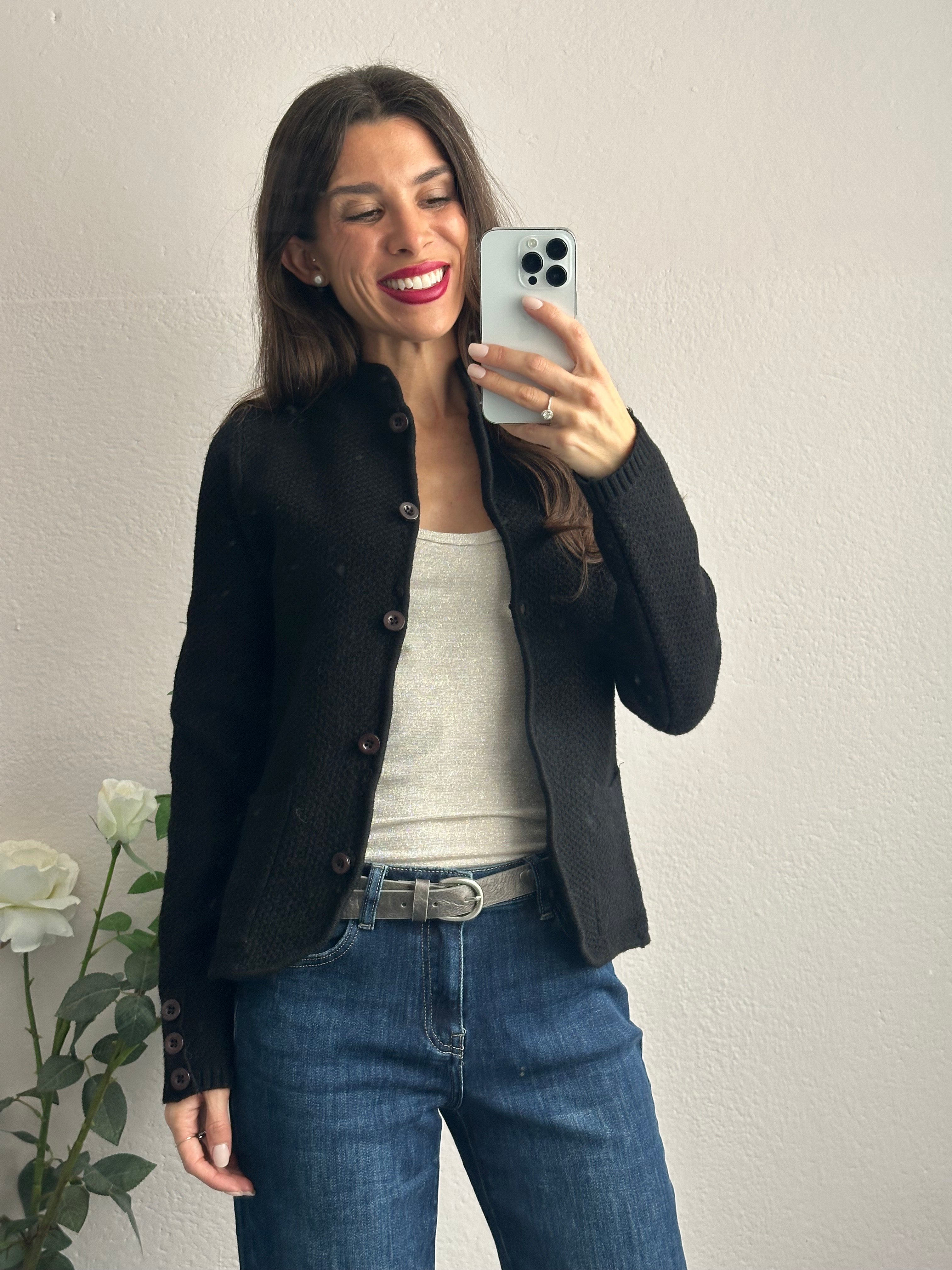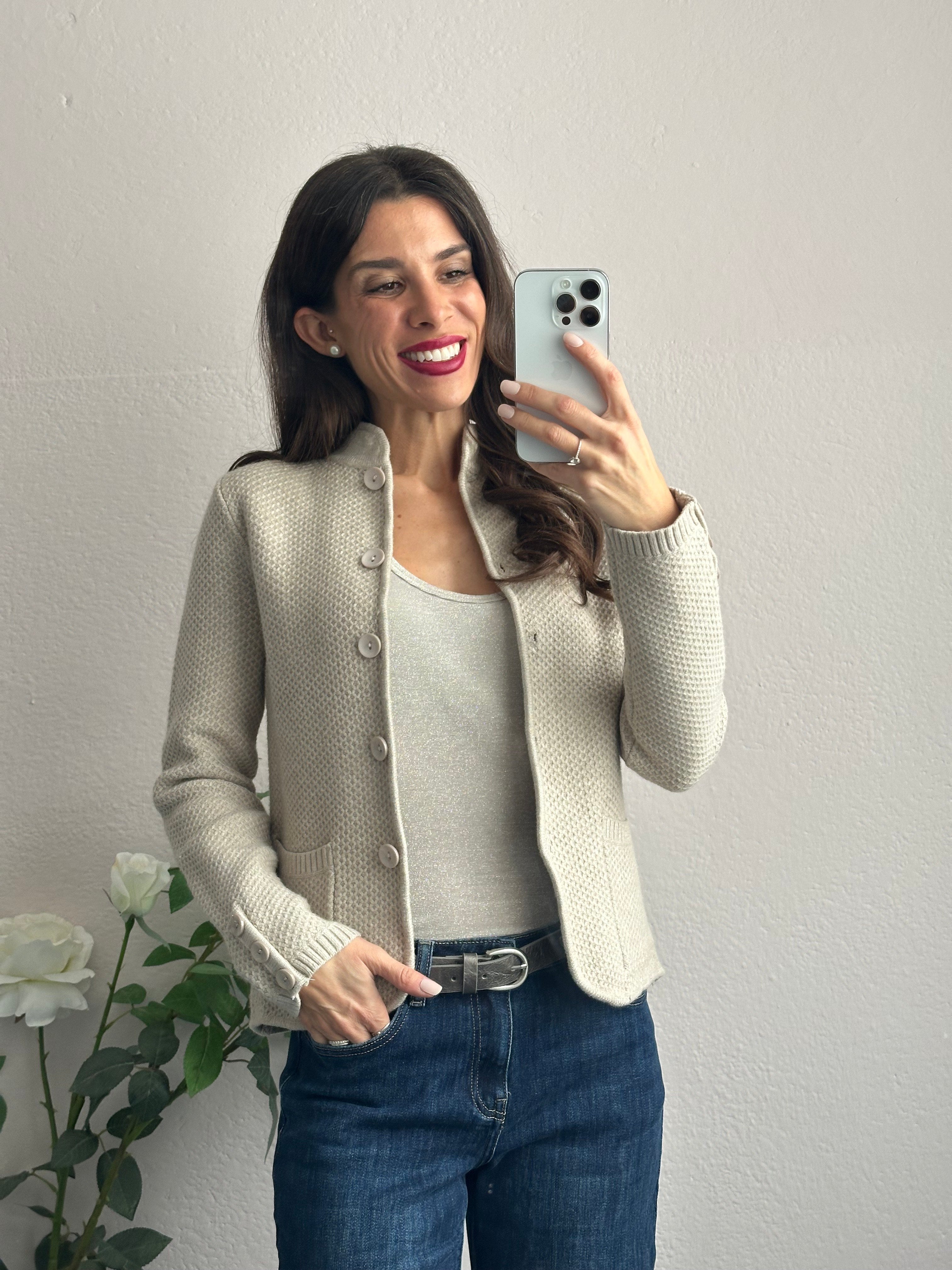 Raffinato cardigan in misto viscosa con una trama lavorata, con bottoni funzionali e tasche pratiche. Dettagli eleganti sui bottoni estesi anche sulle maniche per un tocco di ricercatezza. Perfetto per stratificare con stile, offre comfort e versatilità per il guardaroba quotidiano. Una scelta sofisticata che combina funzionalità e design curato.