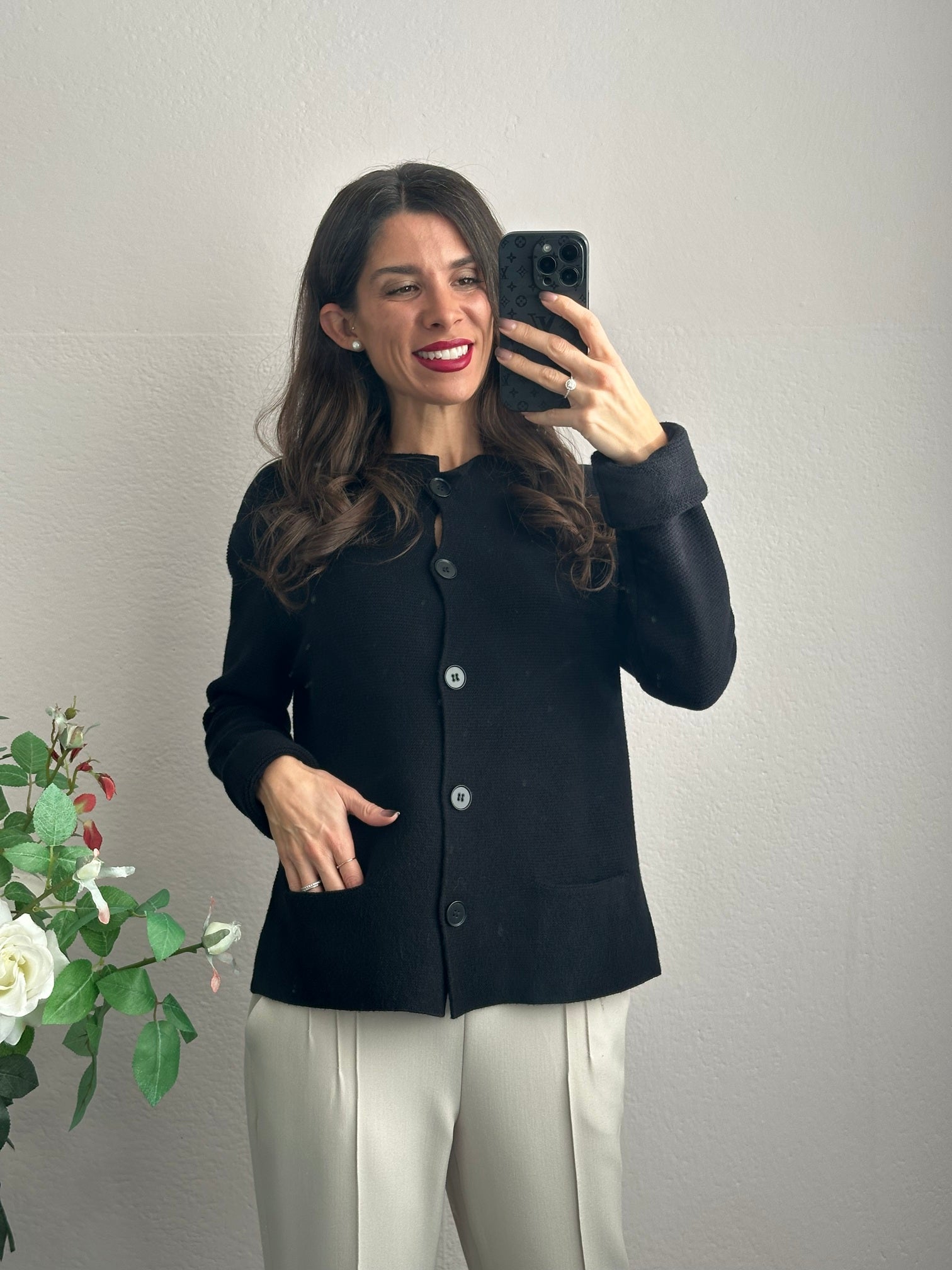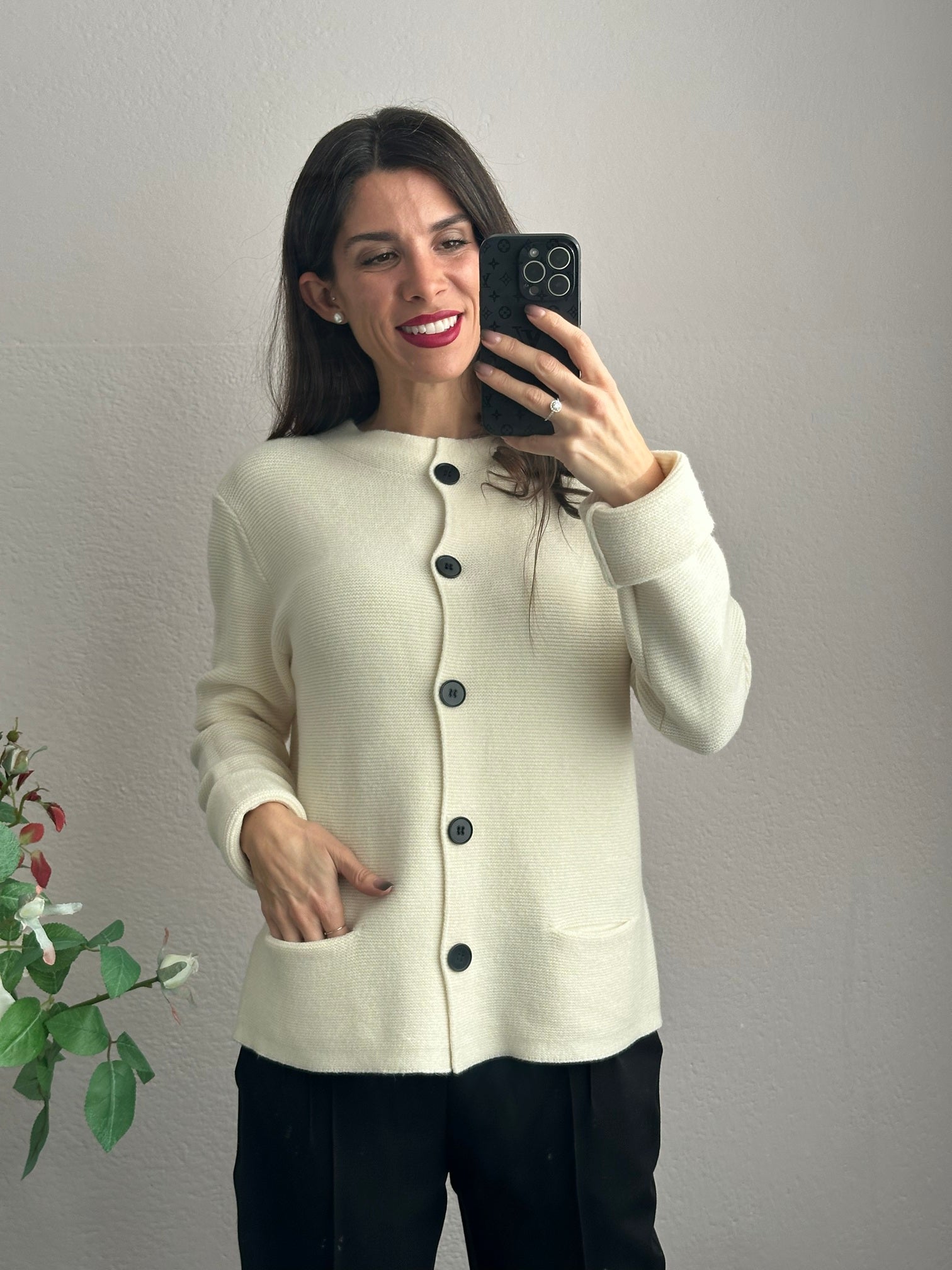 Cardigan raffinato in misto viscosa, caratterizzato da una lavorazione elegante. Le taschine nascoste offrono praticità senza compromessi estetici, mantenendo le linee pulite del capo. Perfetto per chi ricerca versatilità e comfort in un pezzo dal design curato, ideale da indossare su qualsiasi outfit per un tocco di sofisticatezza.