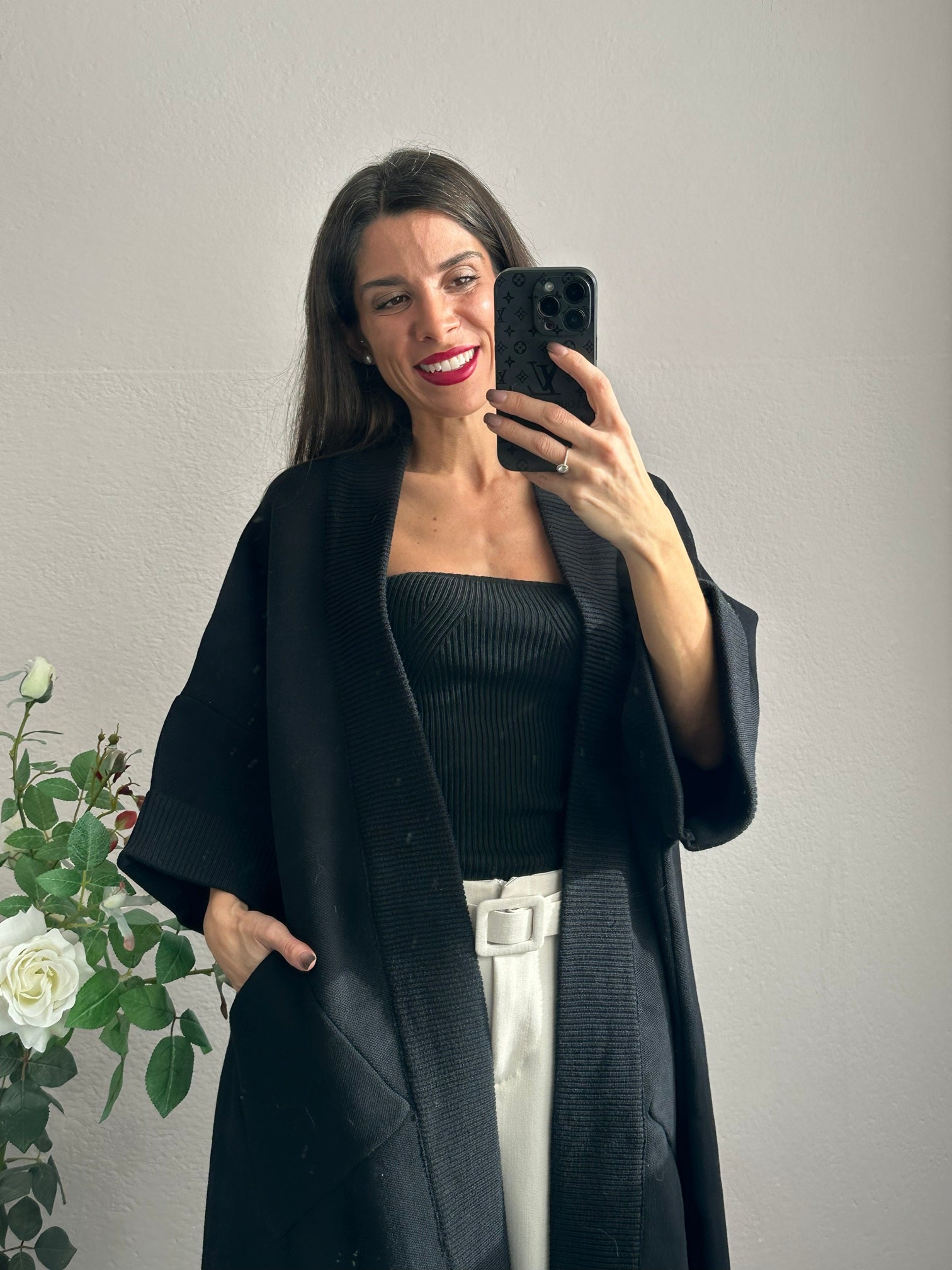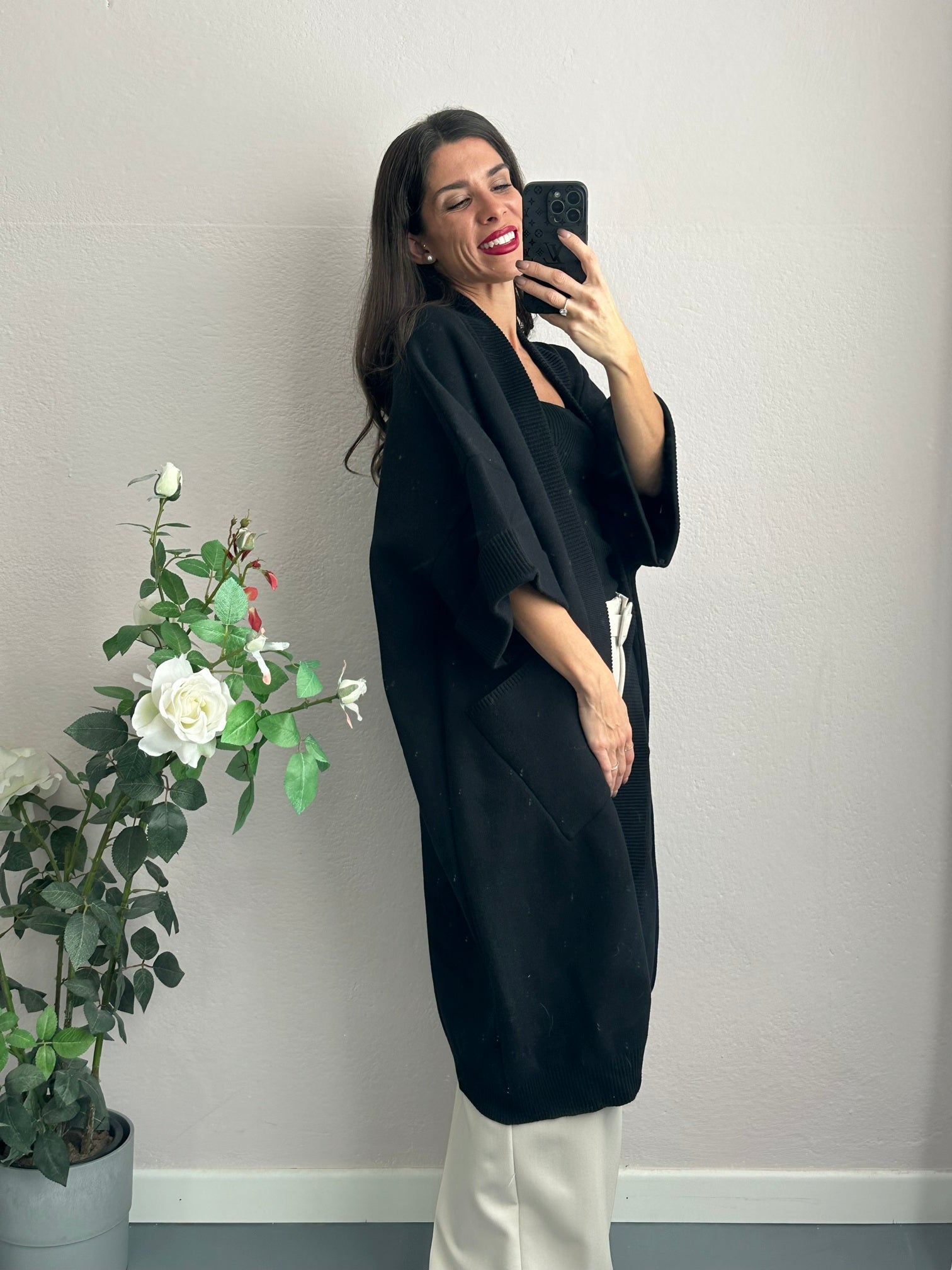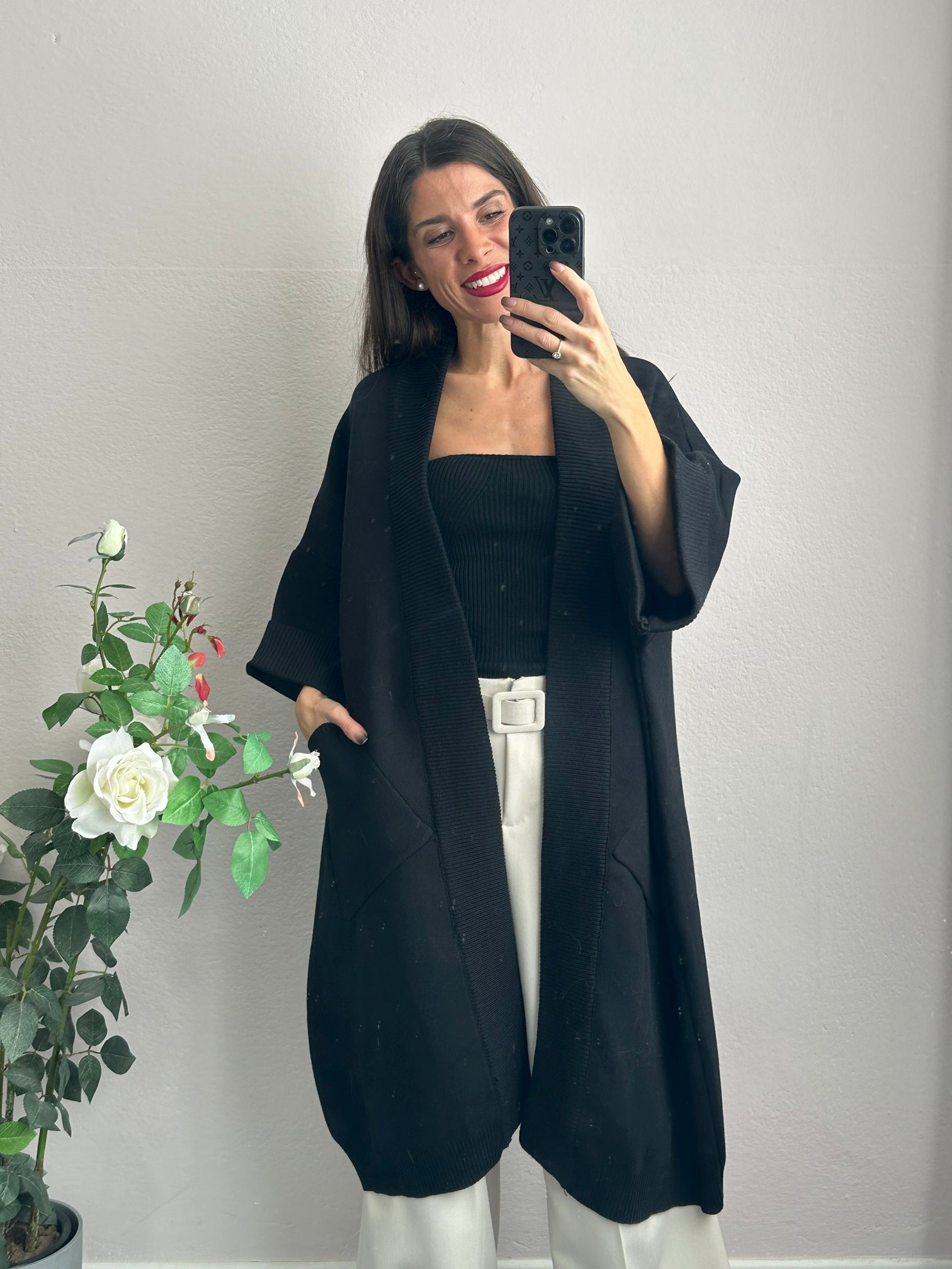 Cardigan lungo nero in misto viscosa dalla silhouette elegante e senza bottoni, perfetto per stratificare con stile. Realizzato con tasche funzionali e profili a costine che definiscono la forma, offre comfort e versatilità per ogni occasione. Un pezzo essenziale che si abbina facilmente a qualsiasi guardaroba, ideale per chi ricerca semplicità e raffinatezza.