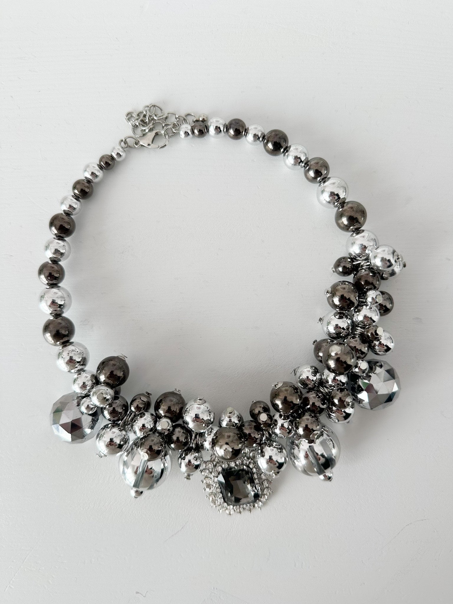 Collana girocollo elegante che unisce semplicità e raffinatezza. Sfere argentate si alternano in una composizione armoniosa, mentre il pendente di strass cattura la luce con brillantezza. Perfetta per valorizzare il décolleté con un tocco di lusso discreto, si adatta sia a occasioni speciali che a look quotidiani sofisticati. Un gioiello versatile che completa qualsiasi outfit con grazia.