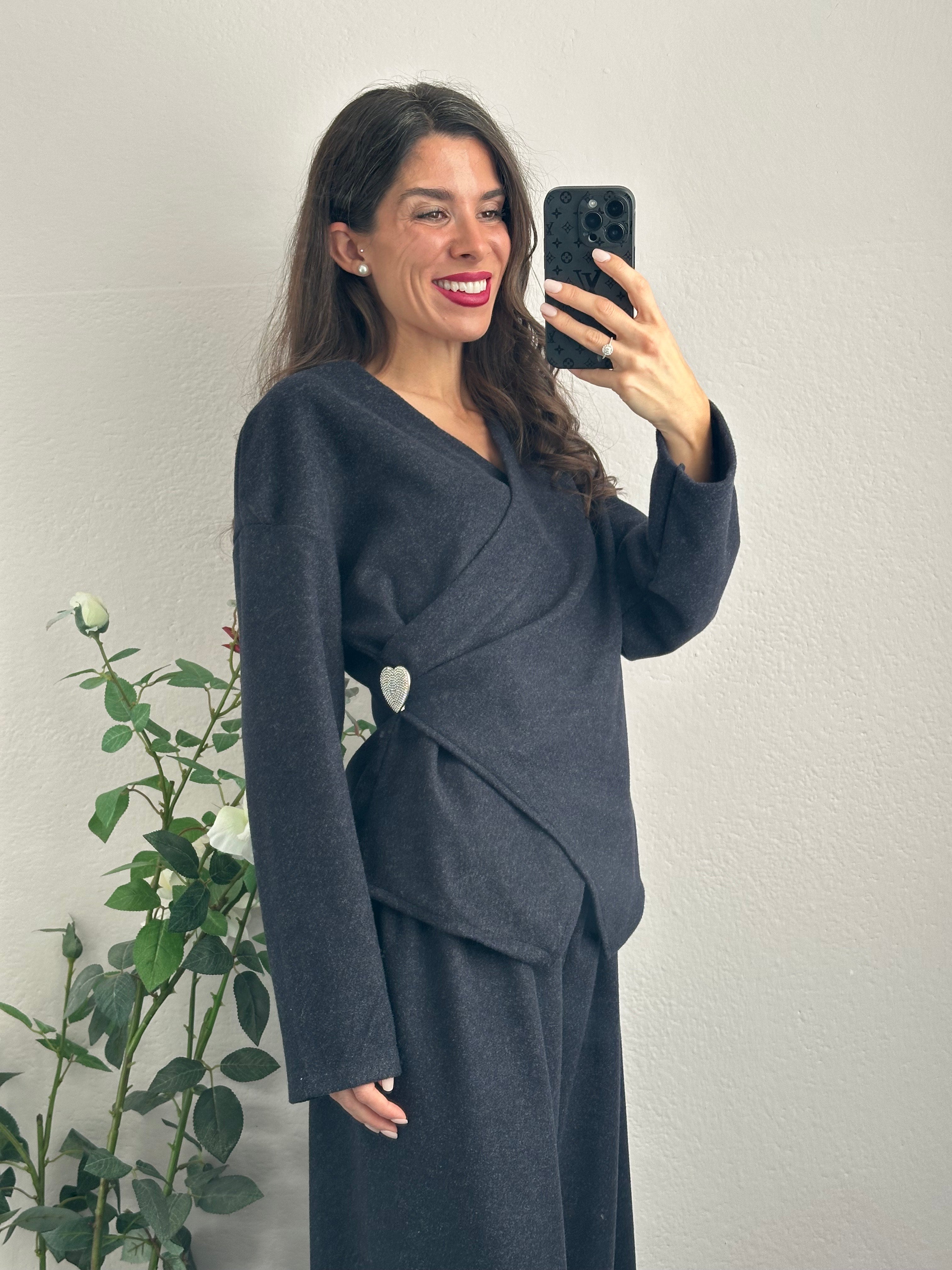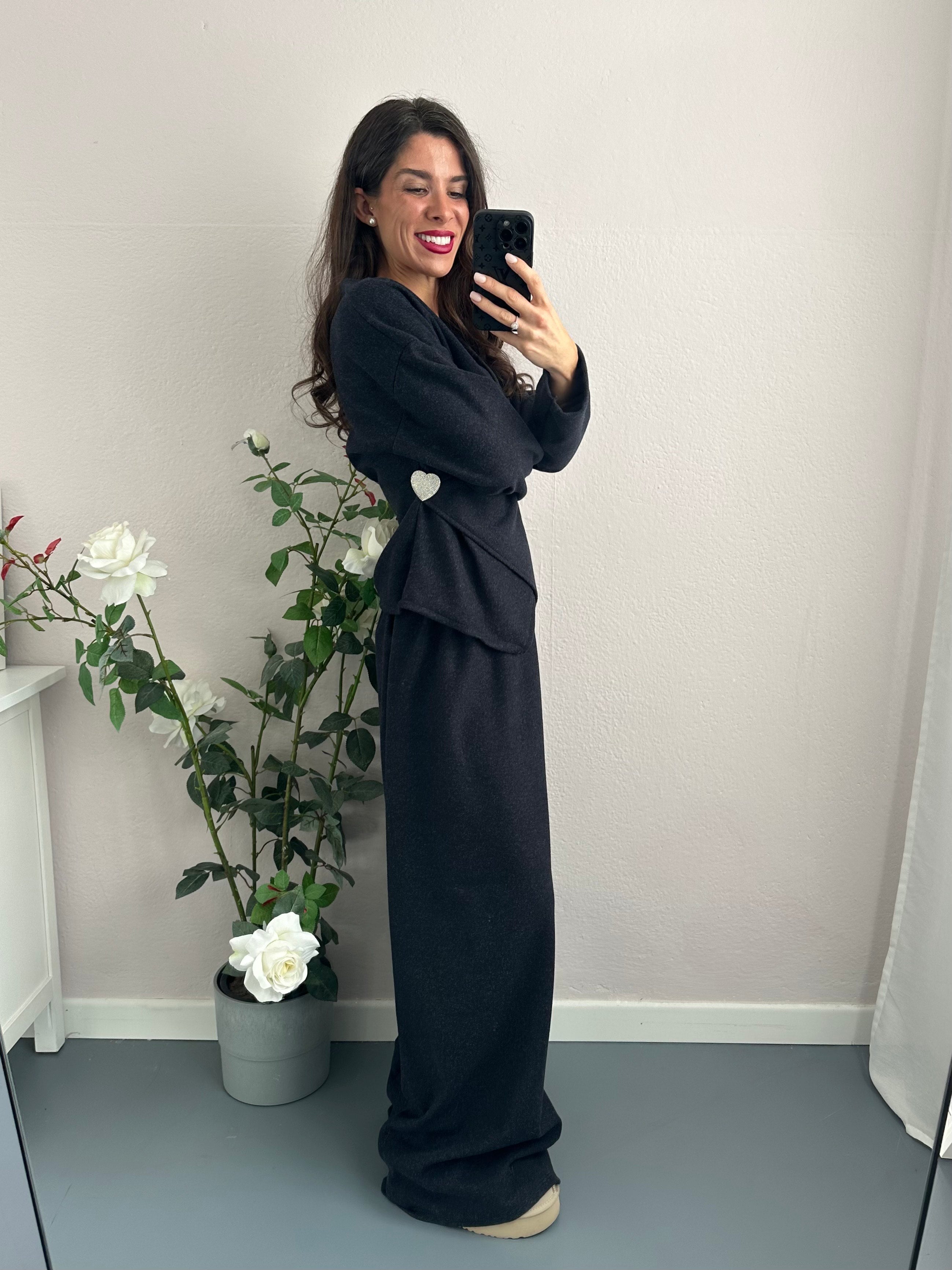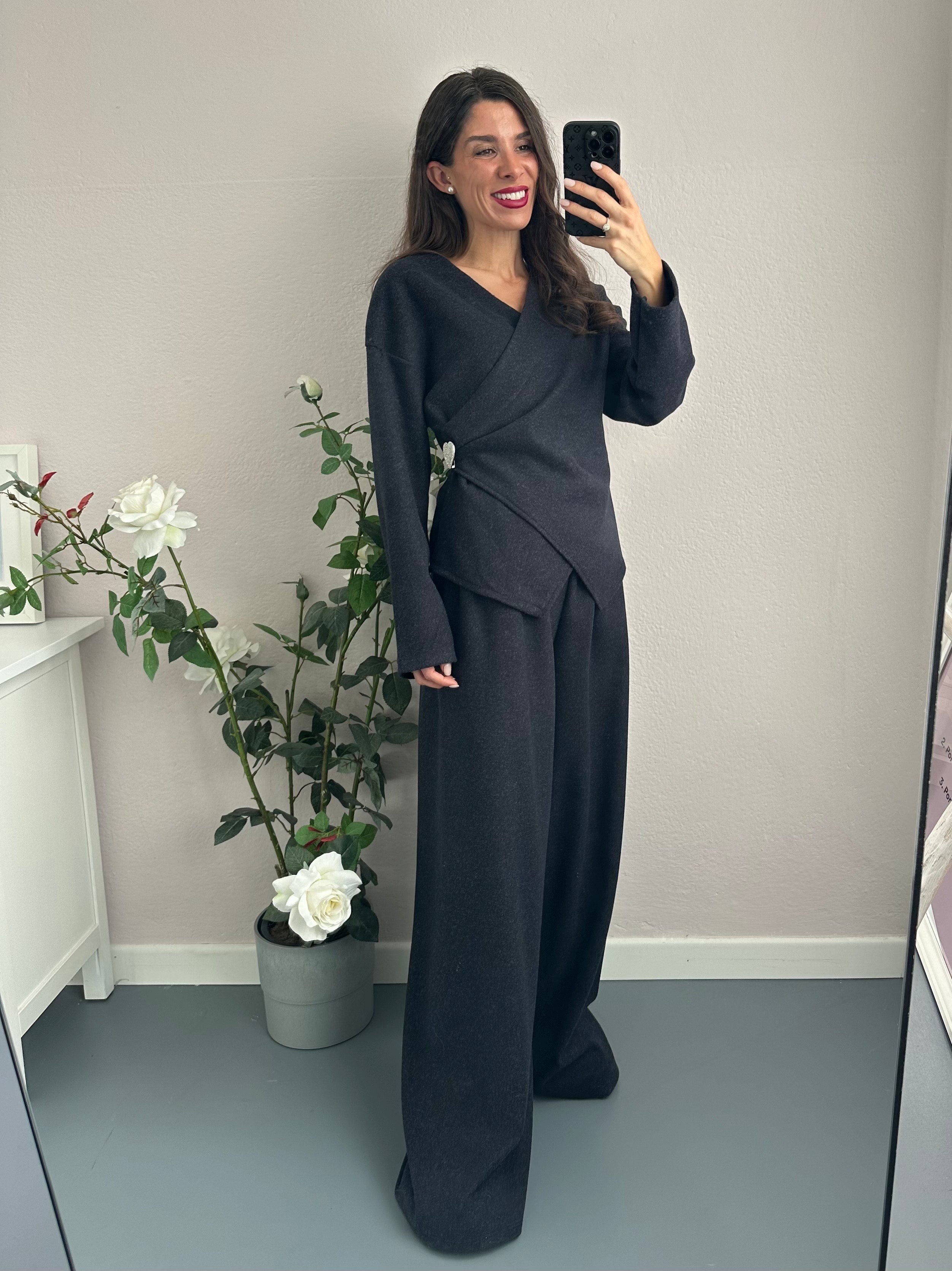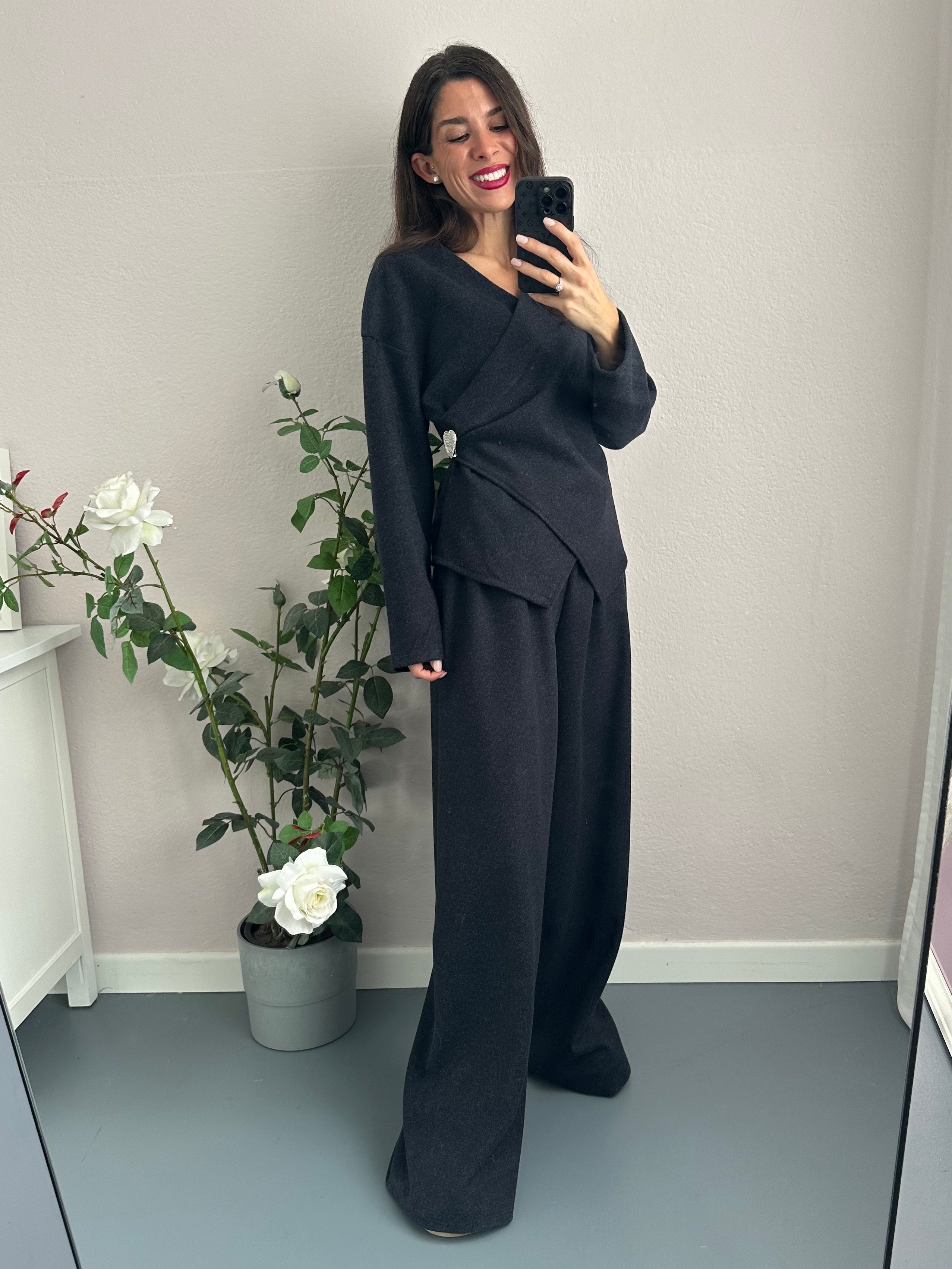 La blusa presenta un elegante intreccio frontale e maniche lunghe che garantiscono calore e stile, abbinata a comodi pantapalazzo con elastico in vita per una vestibilità impeccabile. Il set è completato da una meravigliosa spilla a forma di cuore tempestata di strass, un dettaglio scintillante che aggiunge un tocco di eleganza.