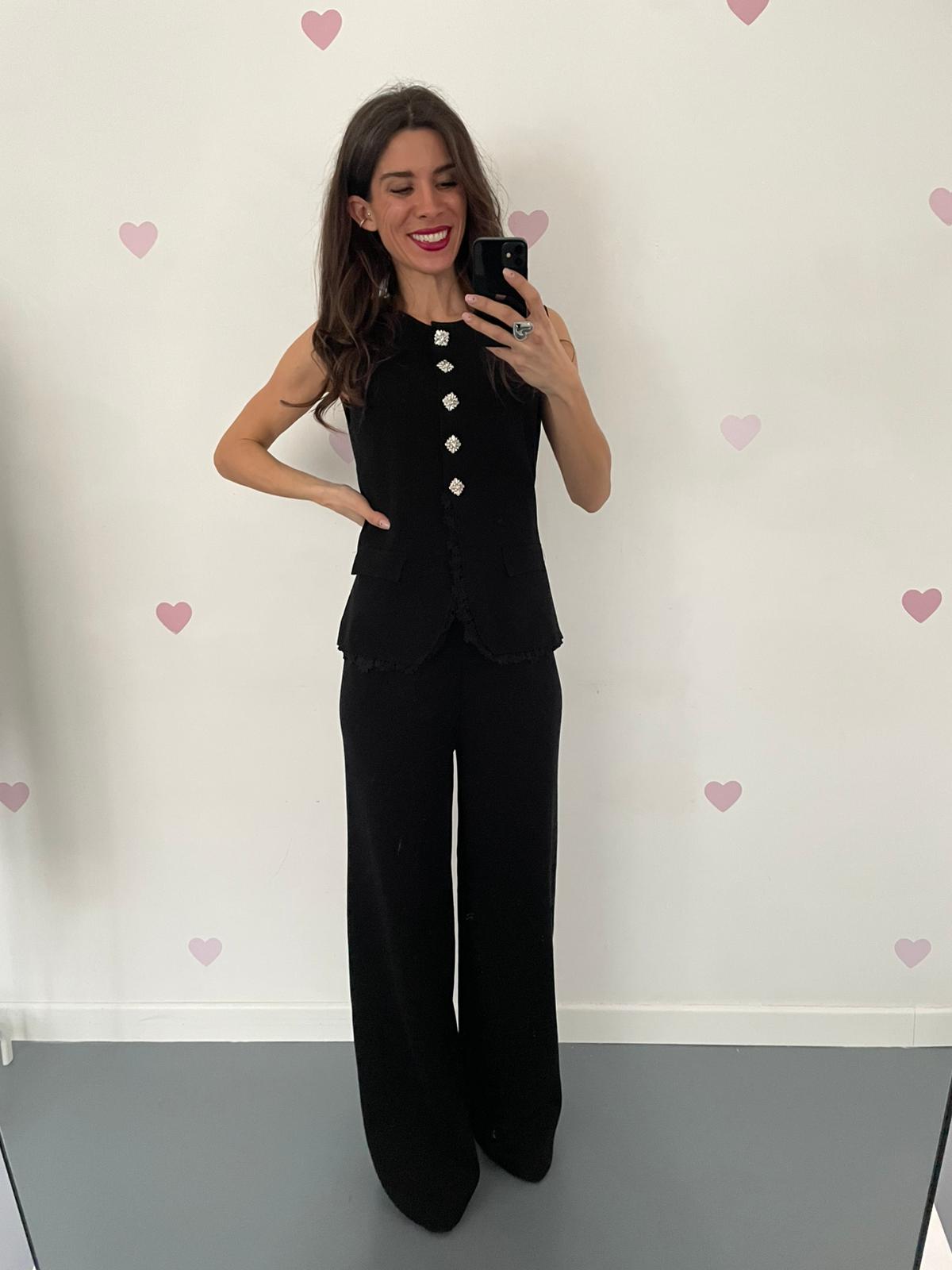 Eleganza senza compromessi. Questo sofisticato ensemble in misto viscosa combina un pantapalazzo comodo con elastico in vita e un blazer smanicato che cattura lo sguardo. Dettagli preziosi come i bottoni gioiello e l'orlo merlato del blazer elevano ogni occasione, dal lavoro agli eventi serali. Perfetto per chi ricerca un look raffinato e versatile che passa senza sforzo dalla giornata alla sera.