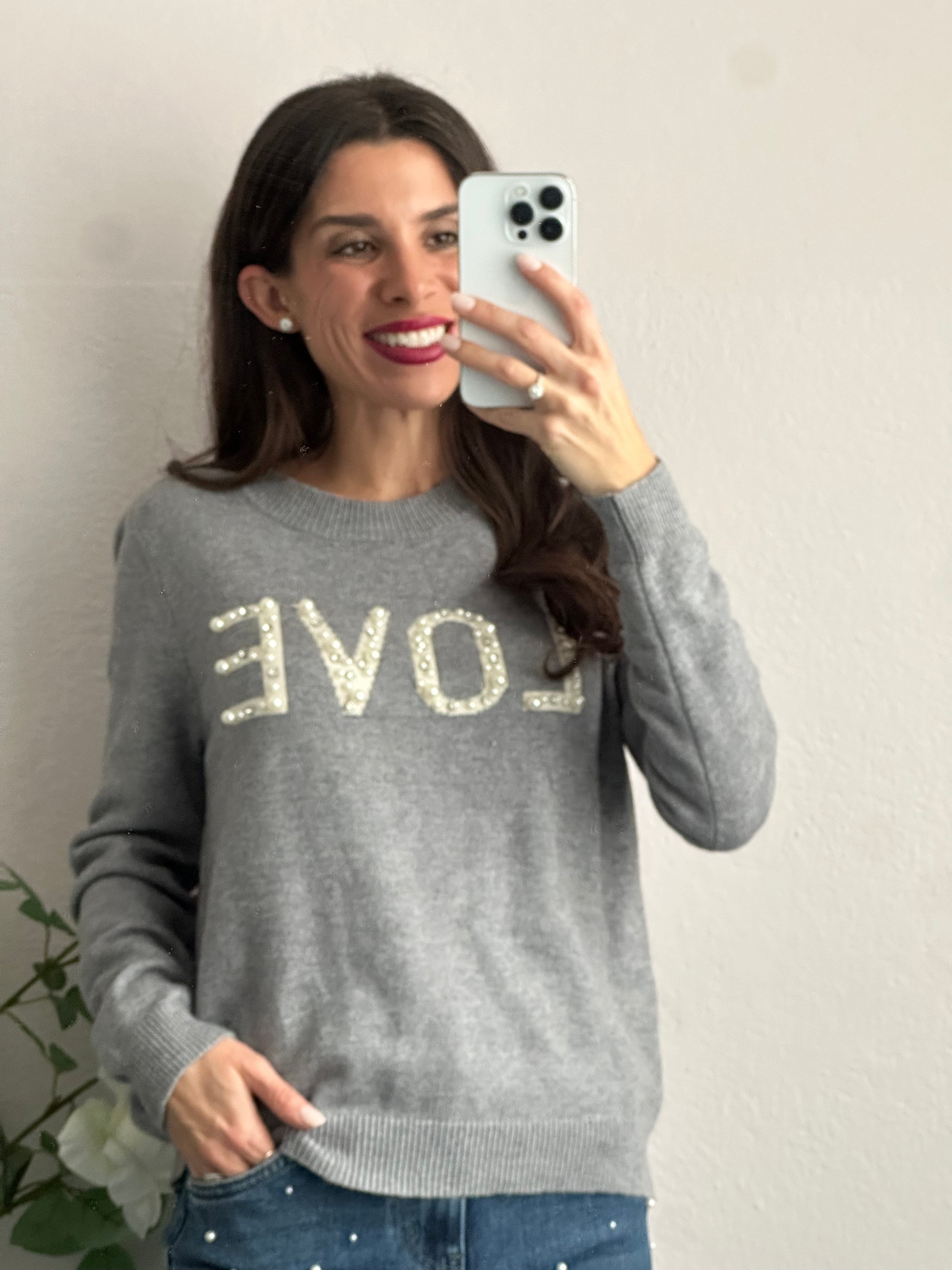 Meraviglioso maglioncino grigio in misto viscosa caldo e coccoloso con una meravigliosa applicazione e perle e strass che formalo la parola LOVE! Un capo davvero molto morbido e confortevole sulla pelle!
