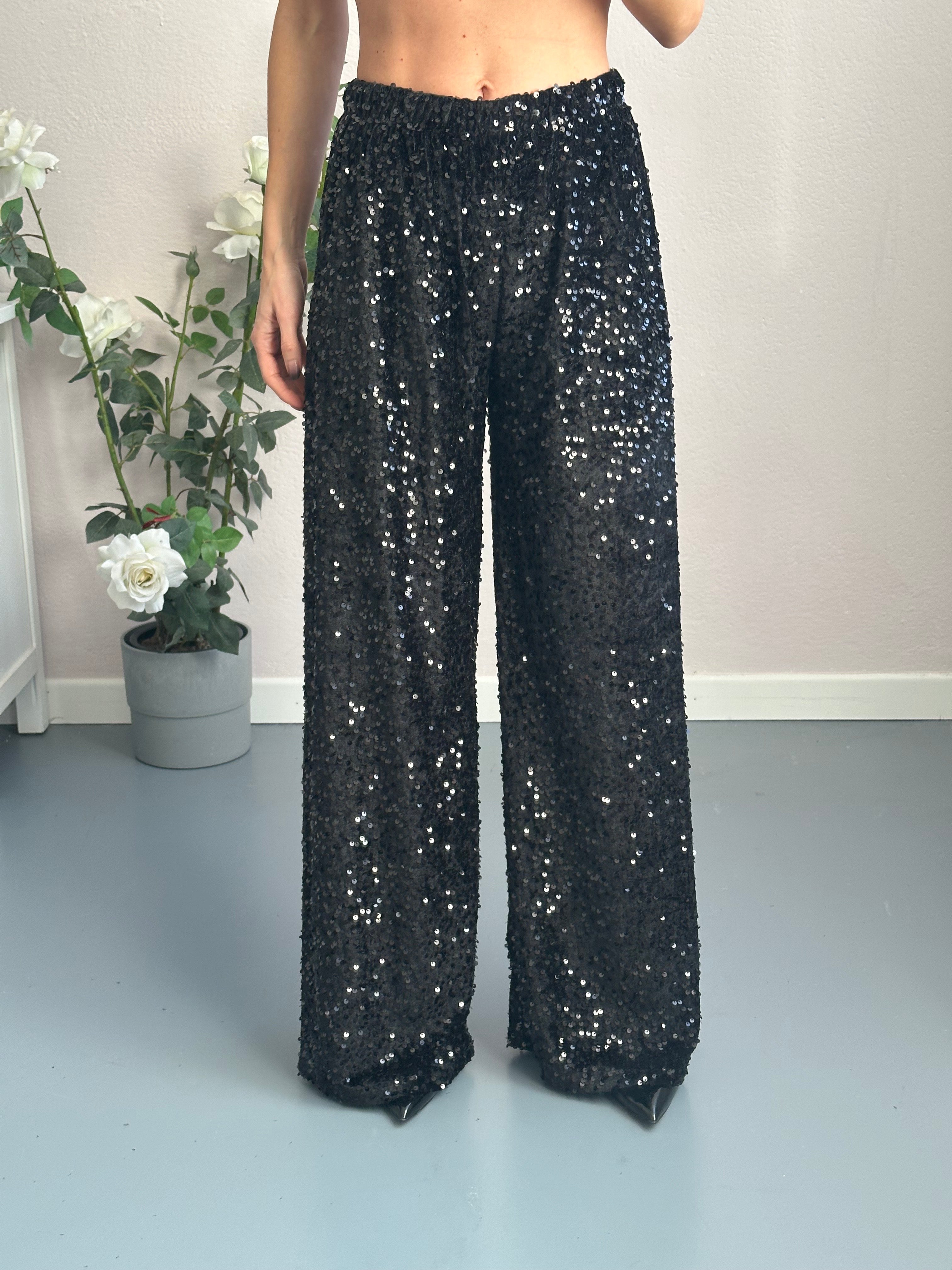 Pantapalazzo nero in vellutino con dettagli scintillanti su tutta la superficie. Un capo sofisticato che cattura la luce con eleganza, perfetto per serate speciali e occasioni che richiedono un tocco di glamour. La texture in vellutino garantisce comfort e una caduta fluida, mentre le paillettes all over creano un effetto luminoso e affascinante. Un'opzione versatile per chi desidera brillare con stile e raffinatezza.