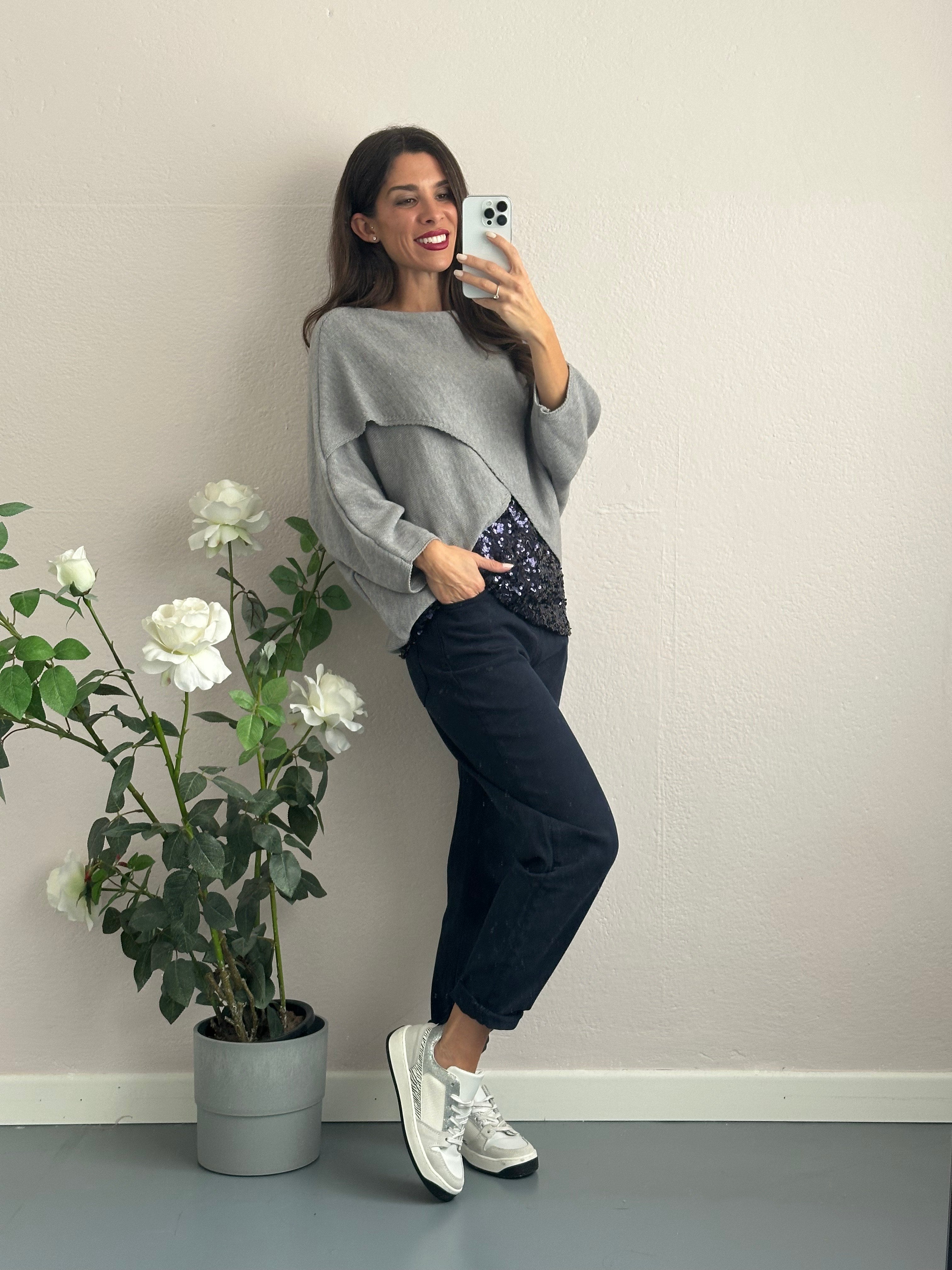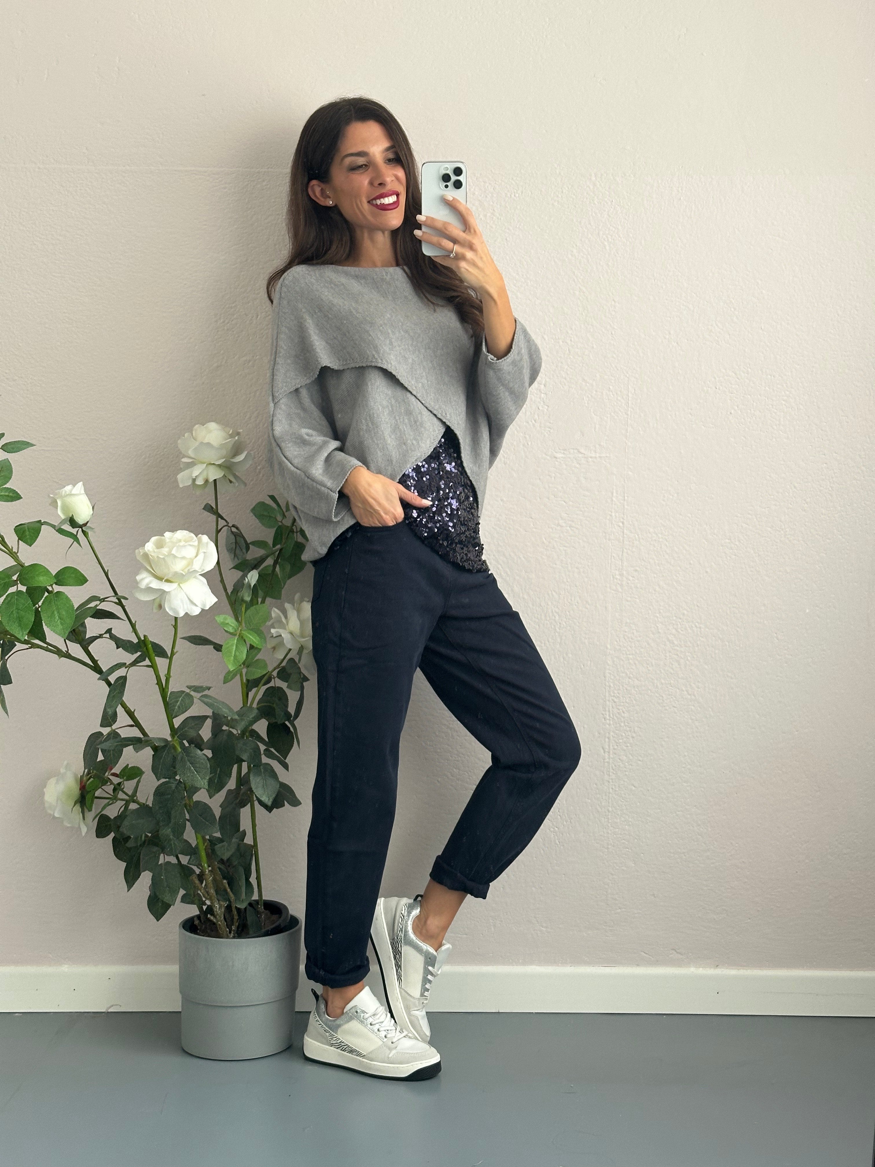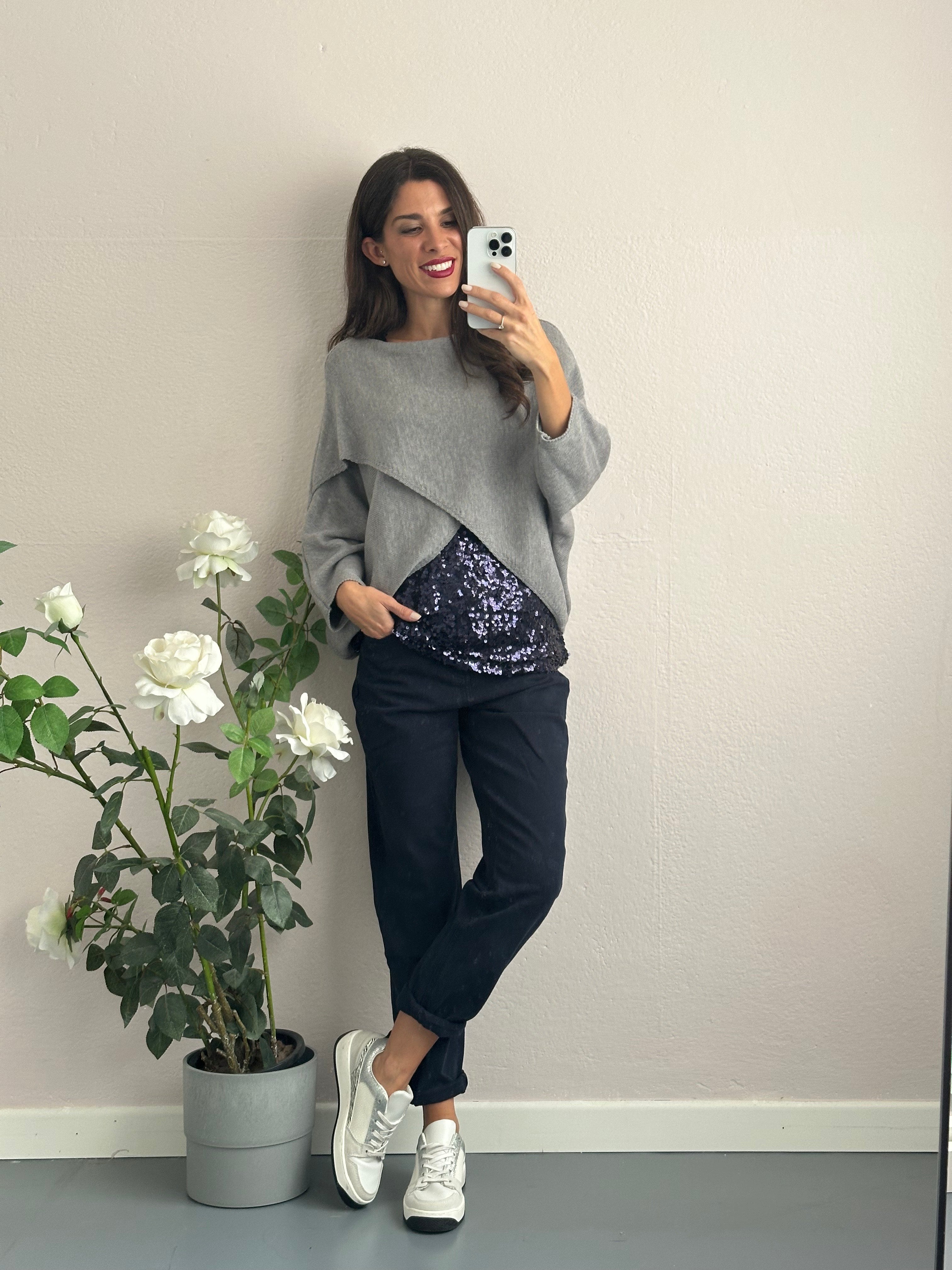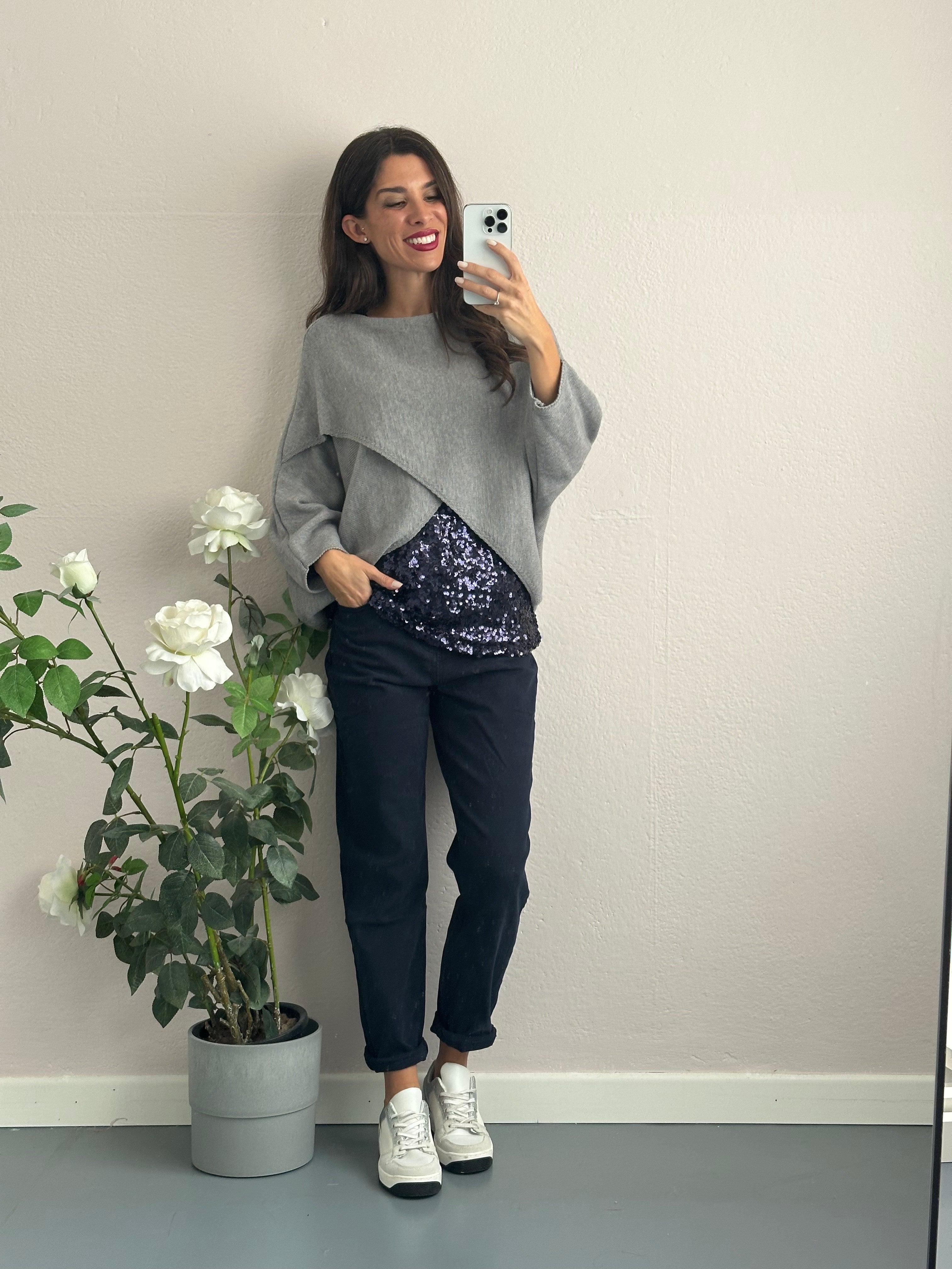 Ho scelto di abbinarci un top con maxi paillettes e spalline larghe blu per portare un meraviglioso luccichio nel tuo outfit. Super sfruttabile da portare anche da solo.