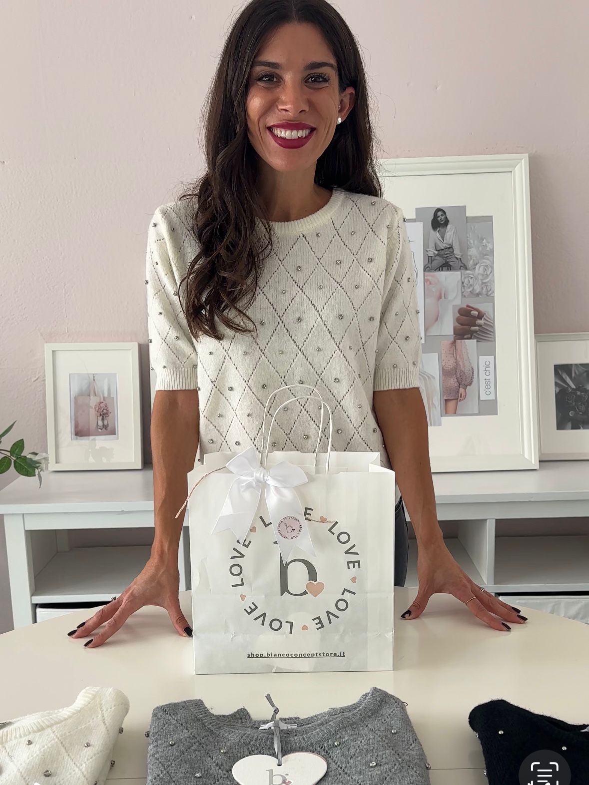 Il maglioncino è un capo davvero unico, una morbida combinazione di lana, perline e strass che avvolge delicatamente in un'abbraccio! Con la manichina corta è ideale in questo periodo, da usare da solo nelle ore più calde della giornata e poi come sottogiacca nelle ore più fresche!