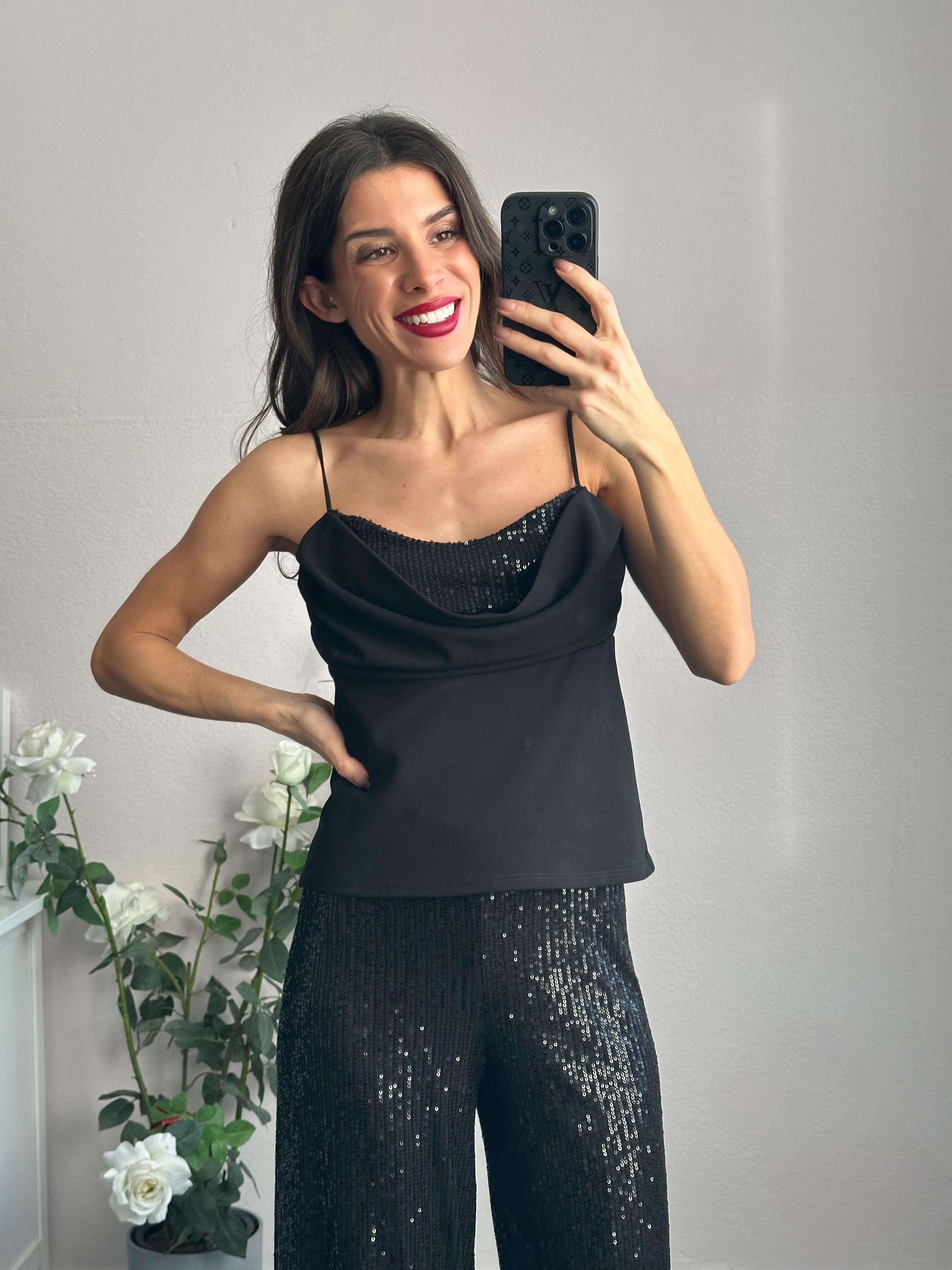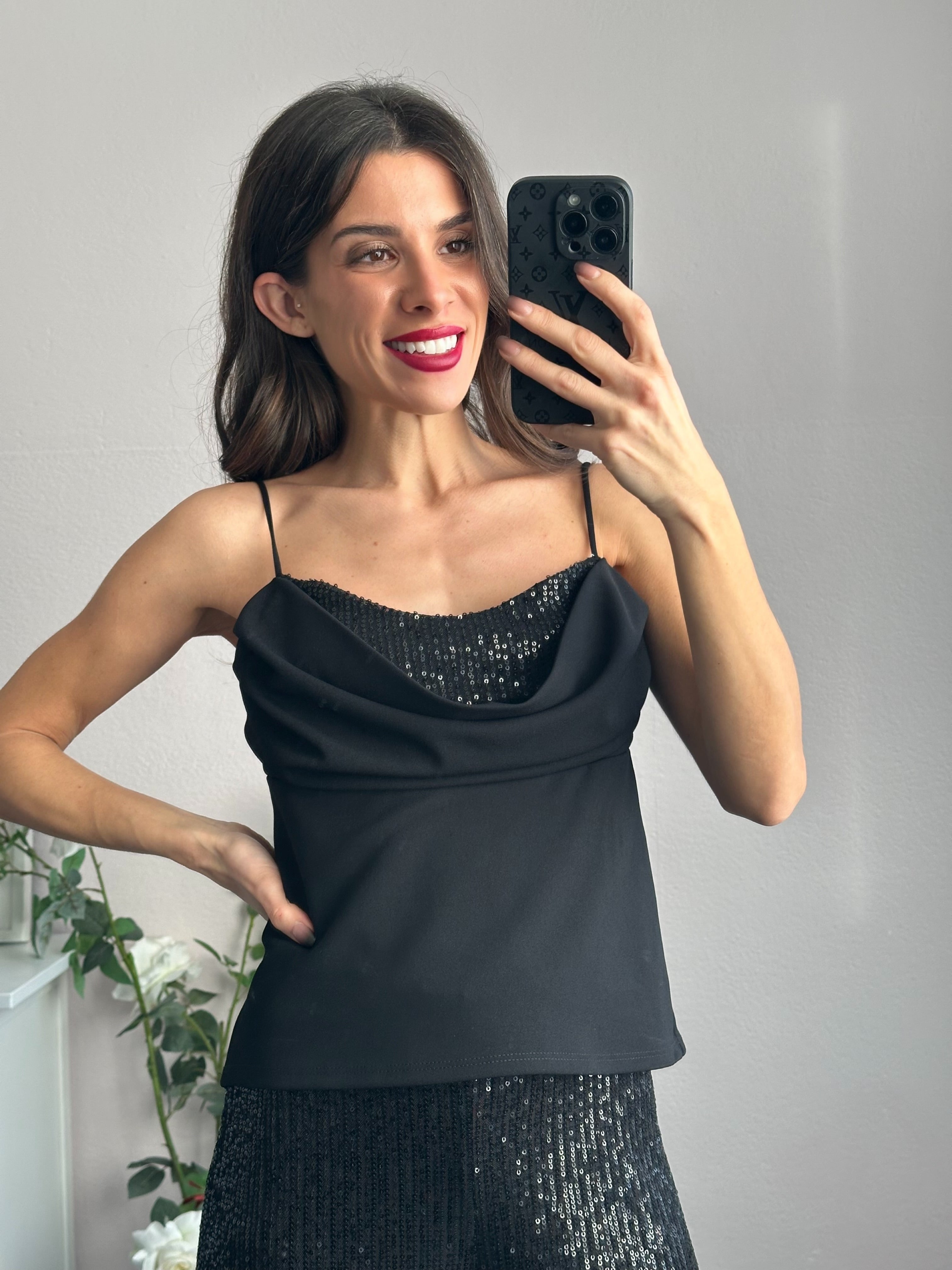 Top elegante con scollo volant che incornicia il décolleté con grazia, impreziosito da paillettes scintillanti che catturano la luce ad ogni movimento. Le spalline sottili regalano un'allure sofisticata e leggera, mentre l'elastico posteriore assicura una vestibilità confortevole e aderente. Perfetto per serate speciali, cene eleganti o look da festa che richiedono un tocco di brillantezza.